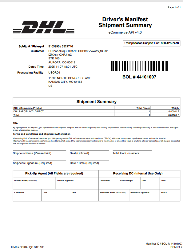 Once a manifest is generated, the Driver Summary Manifest (DSM) will be emailed to the client's specified email addresses.